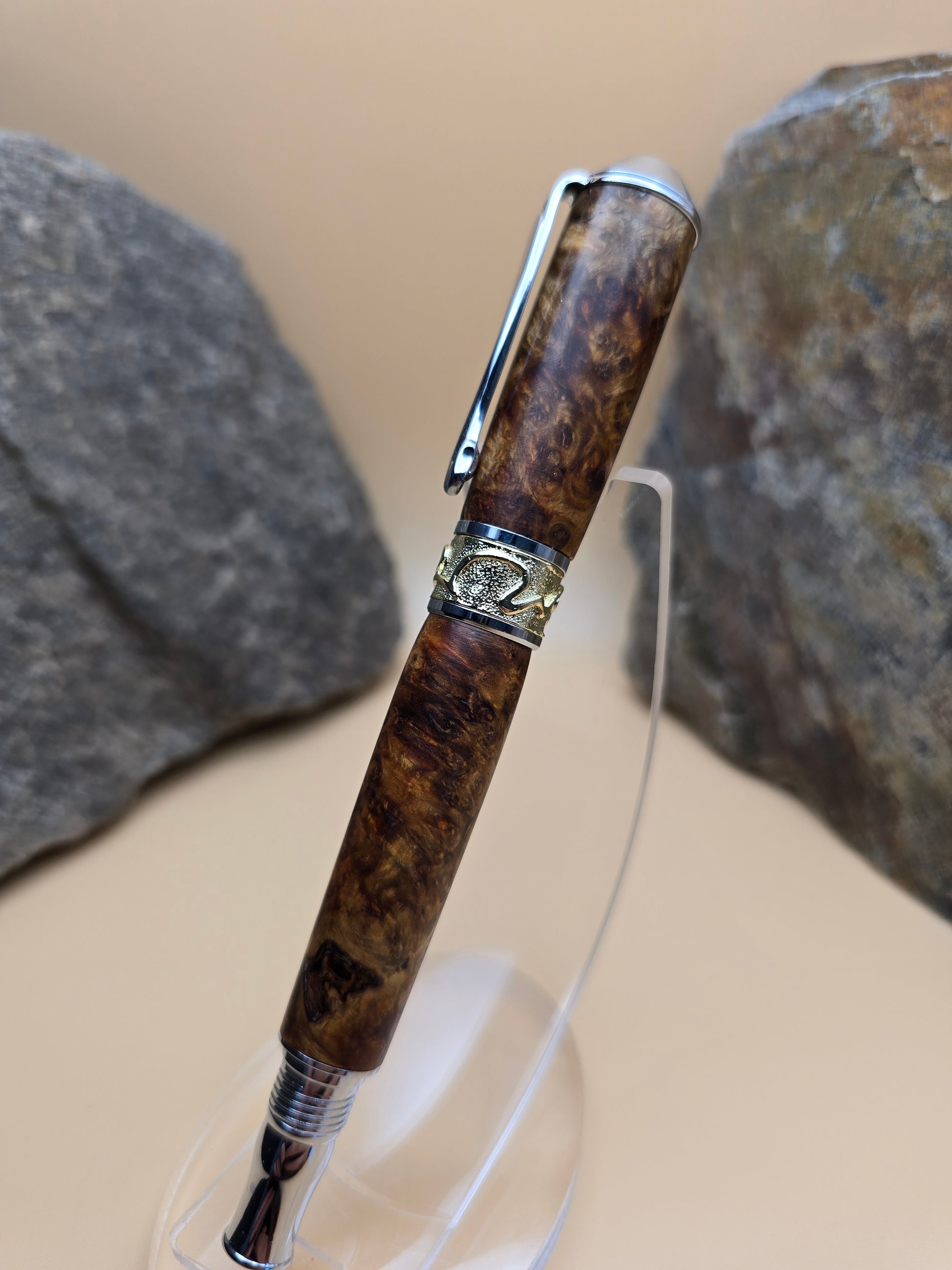 This pen features a postable cap, 22k Gold accents all over, as well as an intricate design on the center band.