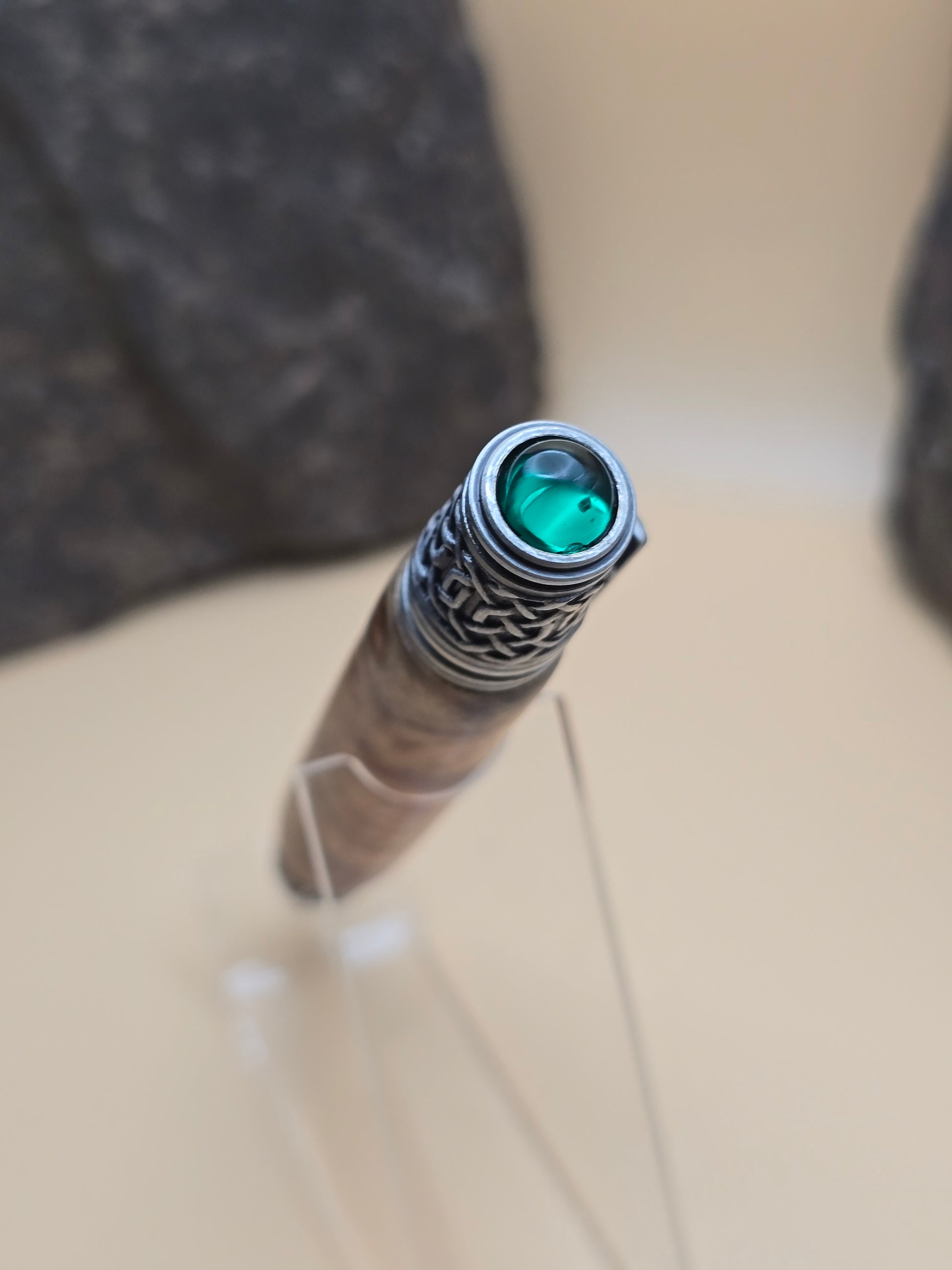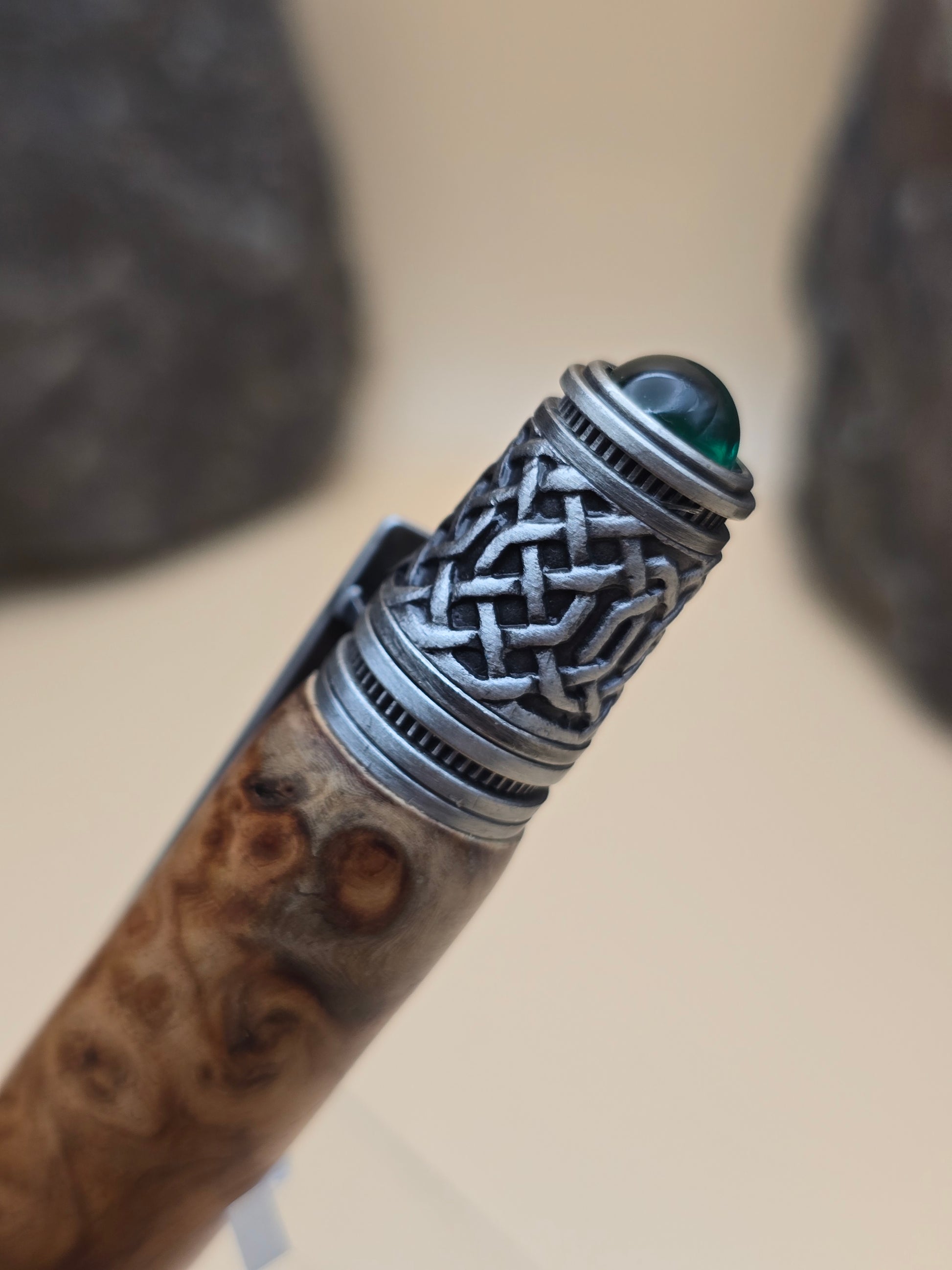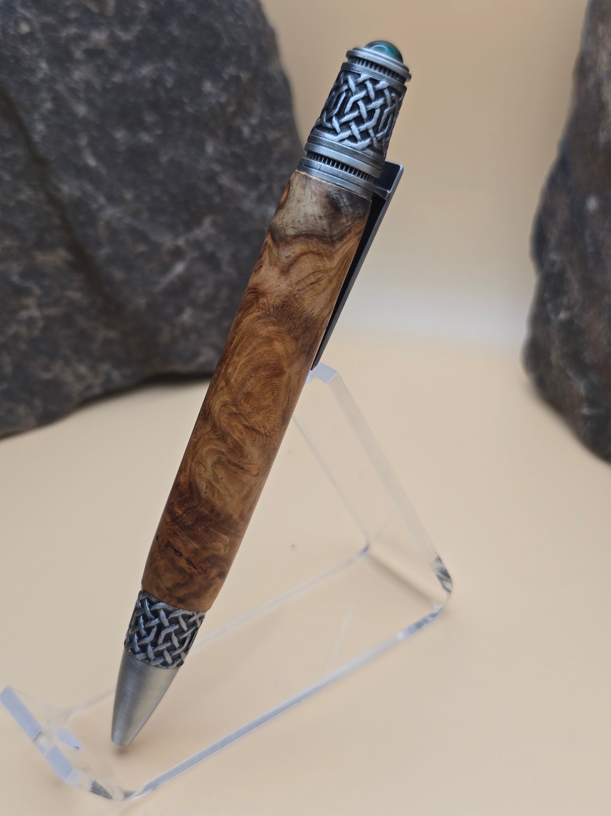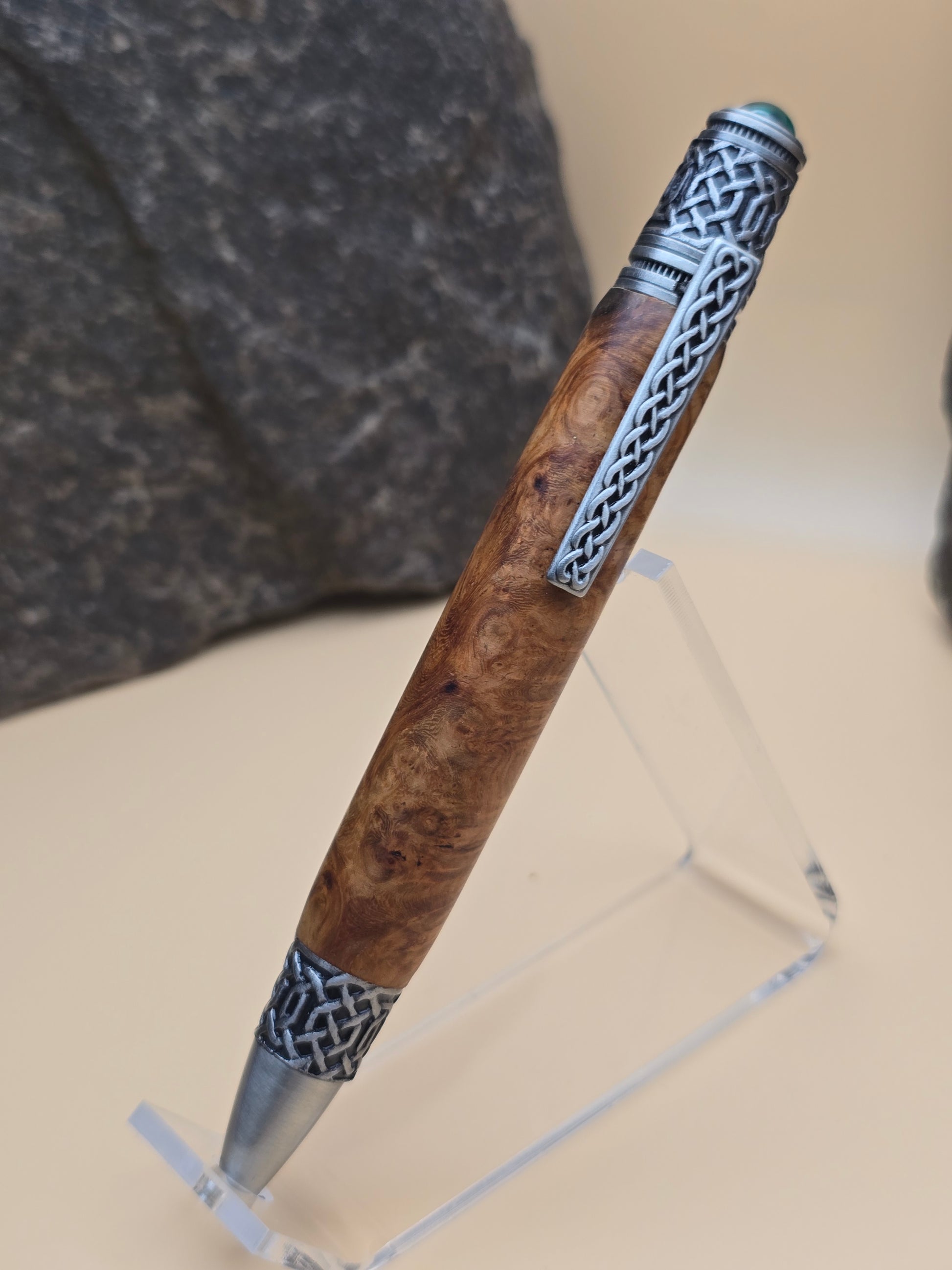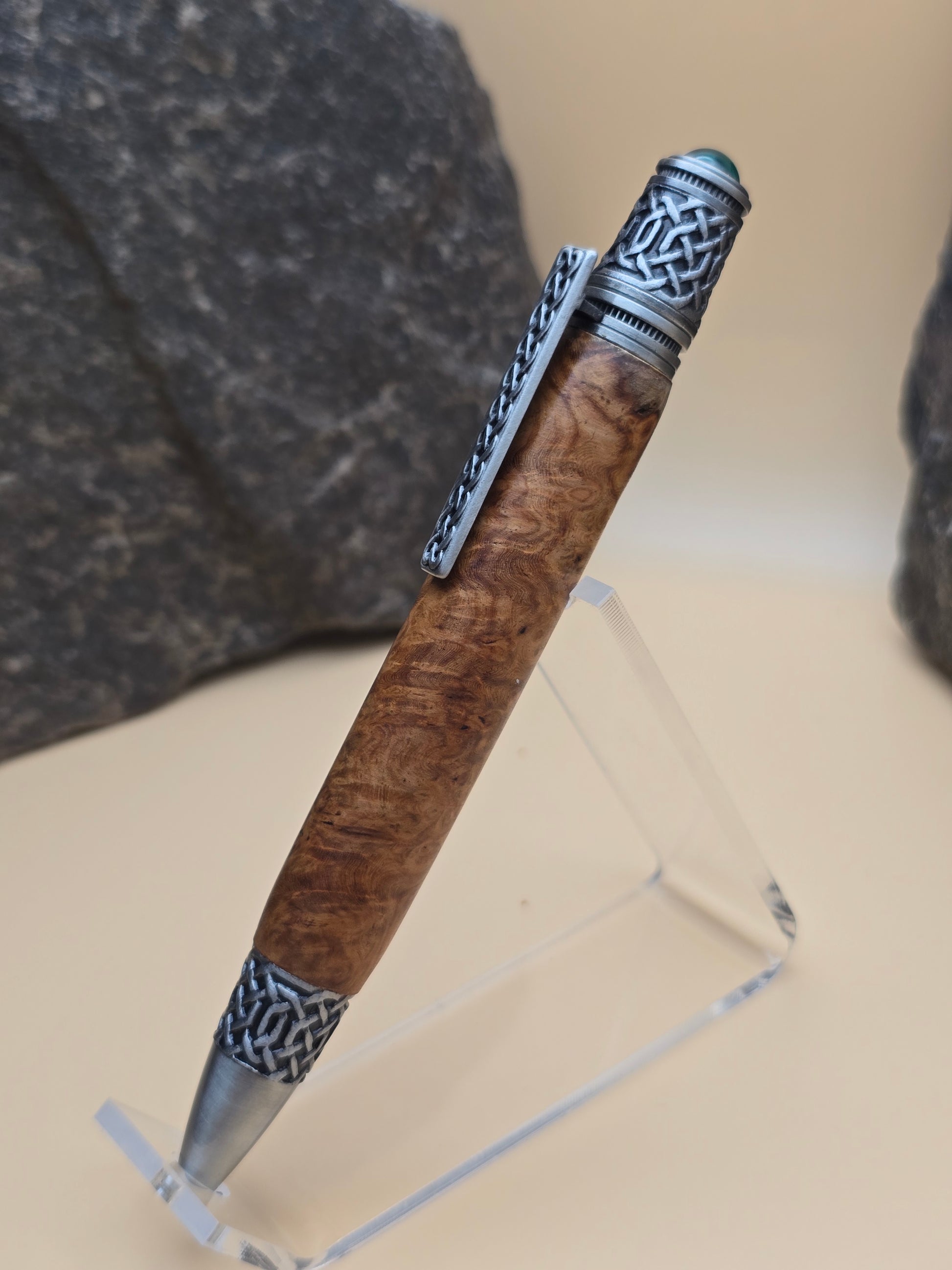 Rare Amboyna Burl, paired with this beautiful celtic themed Ballpoint pen. Atop is a lab grown emerald, with celtic detail throughout the pen.