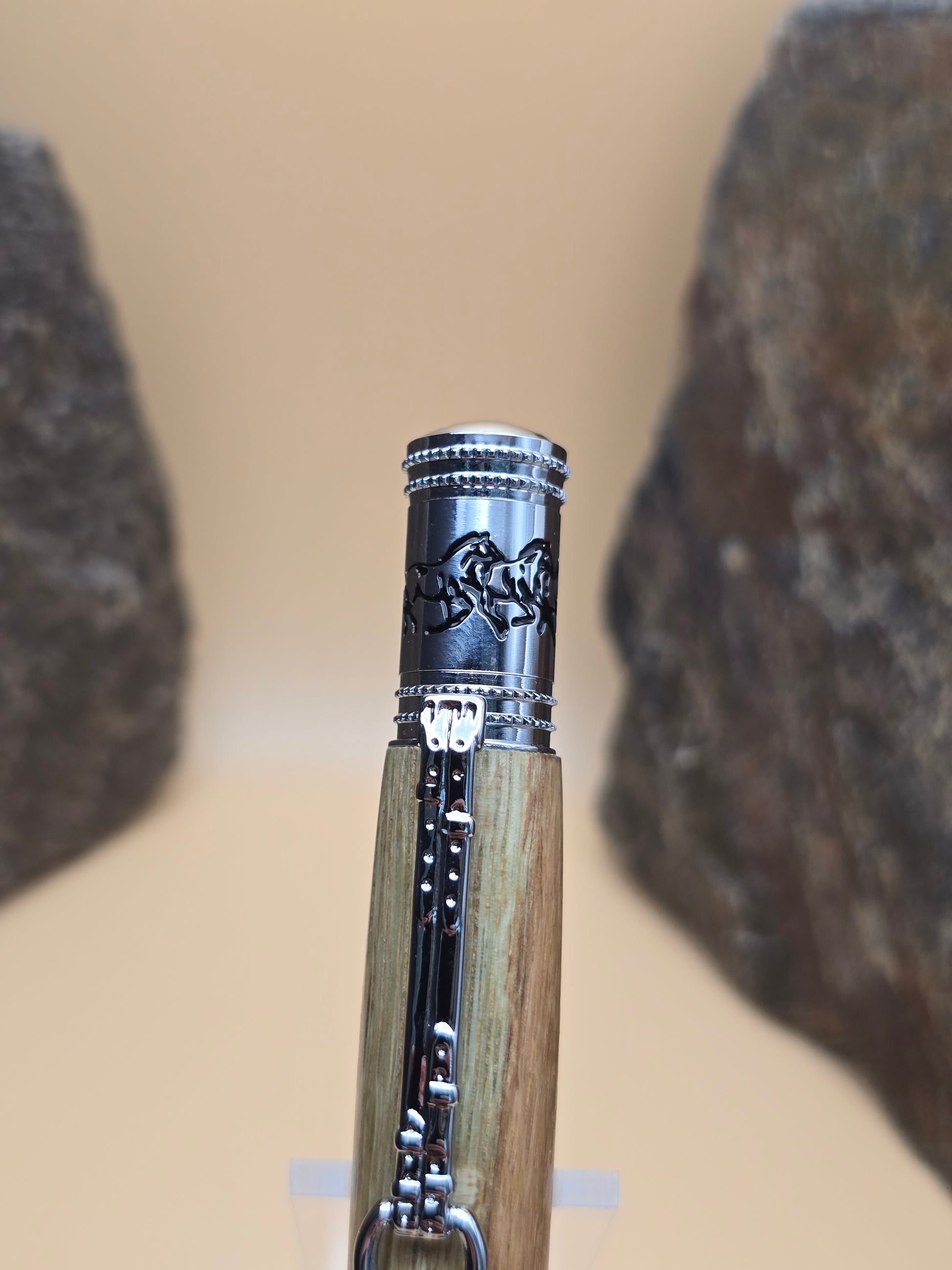 Featuring Finely detailed Horse designs on the crown, clip, and grip.