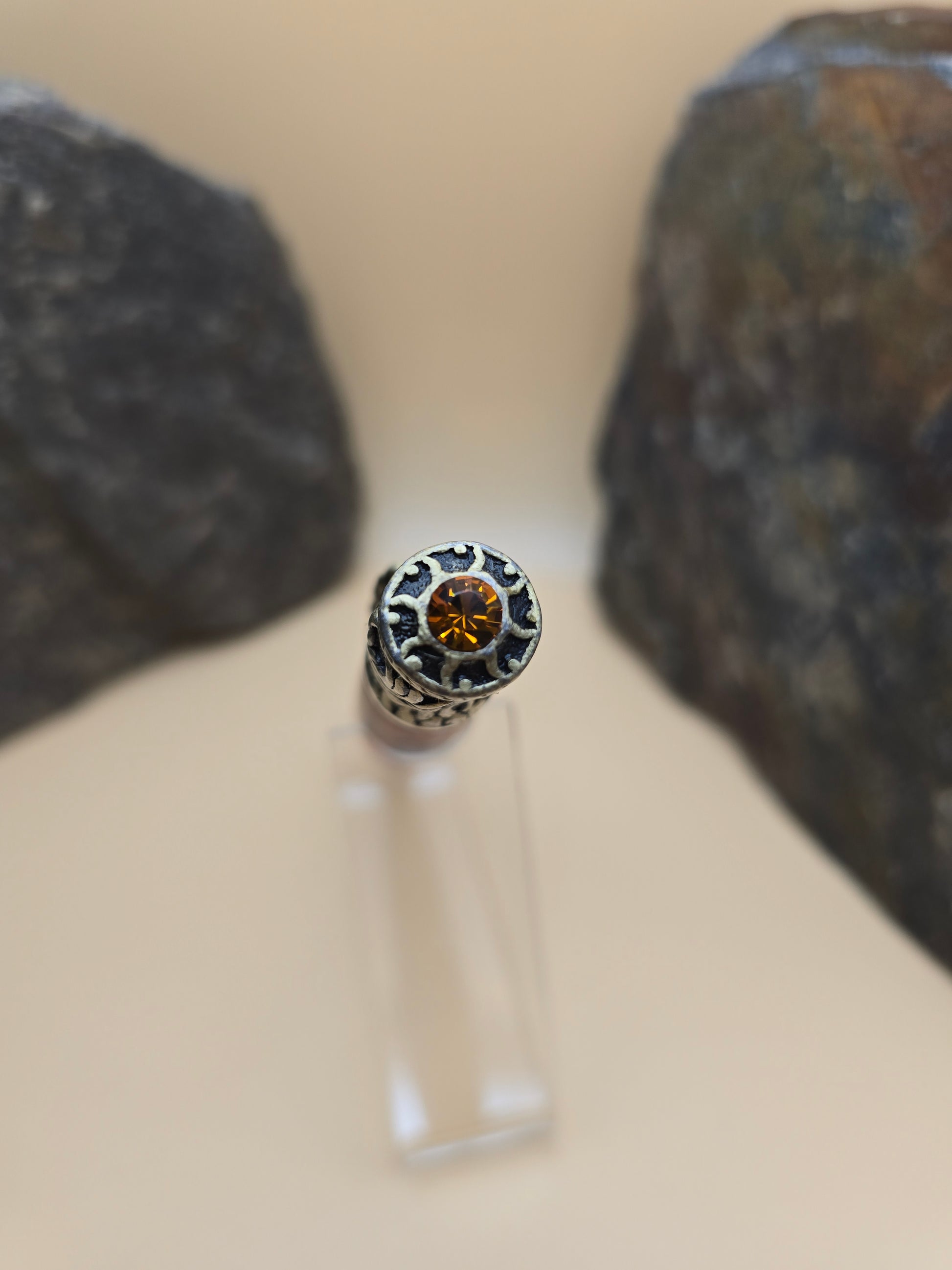 Paired with rare amboyna burl wood, featuring Swarovski amber crystals, and detailed design of a Pheonix on the crown of the pen