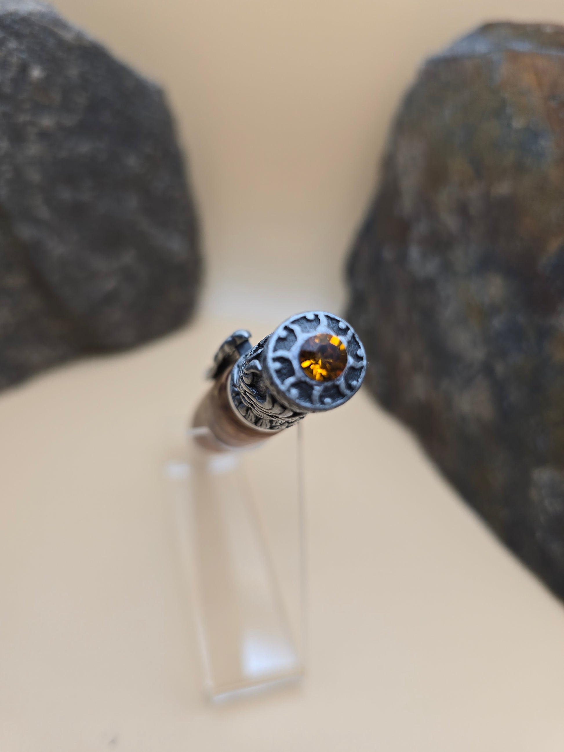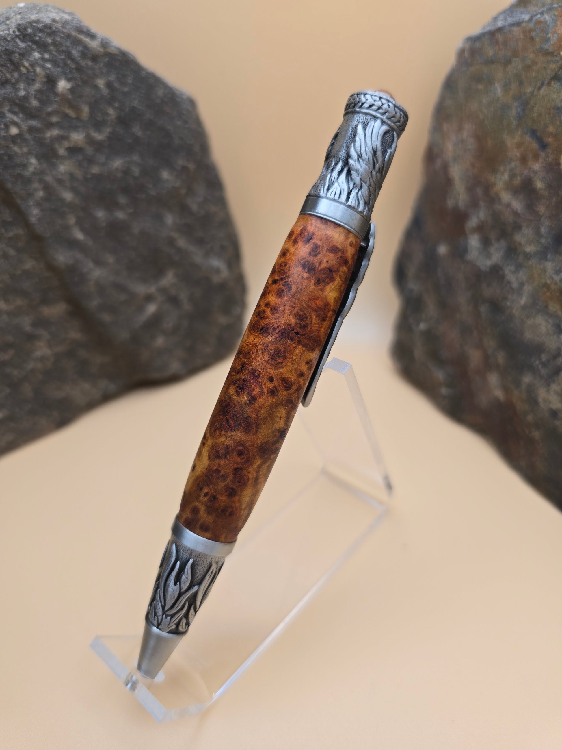 Paired with rare amboyna burl wood, featuring Swarovski amber crystals, and detailed design of a Pheonix on the crown of the pen