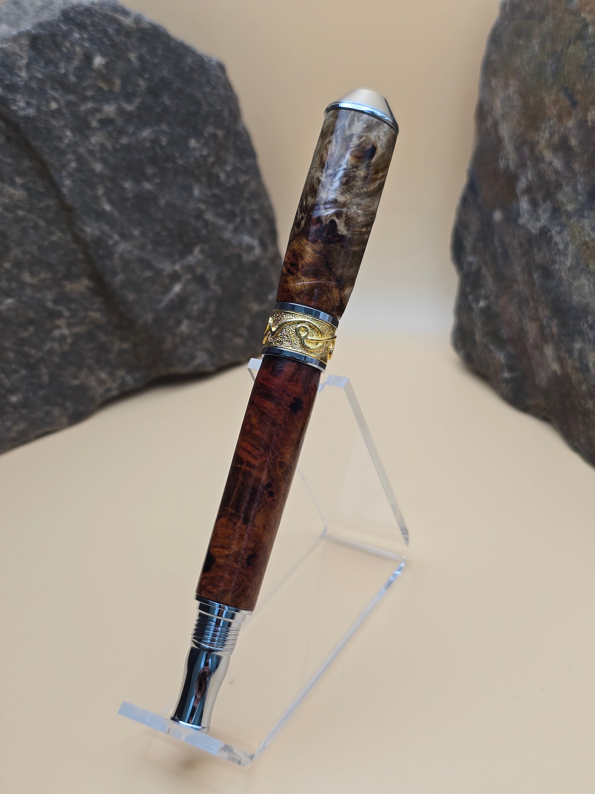 Premium AAA Grade Amboyna burl, paired with chrome and 22k Gold accents.