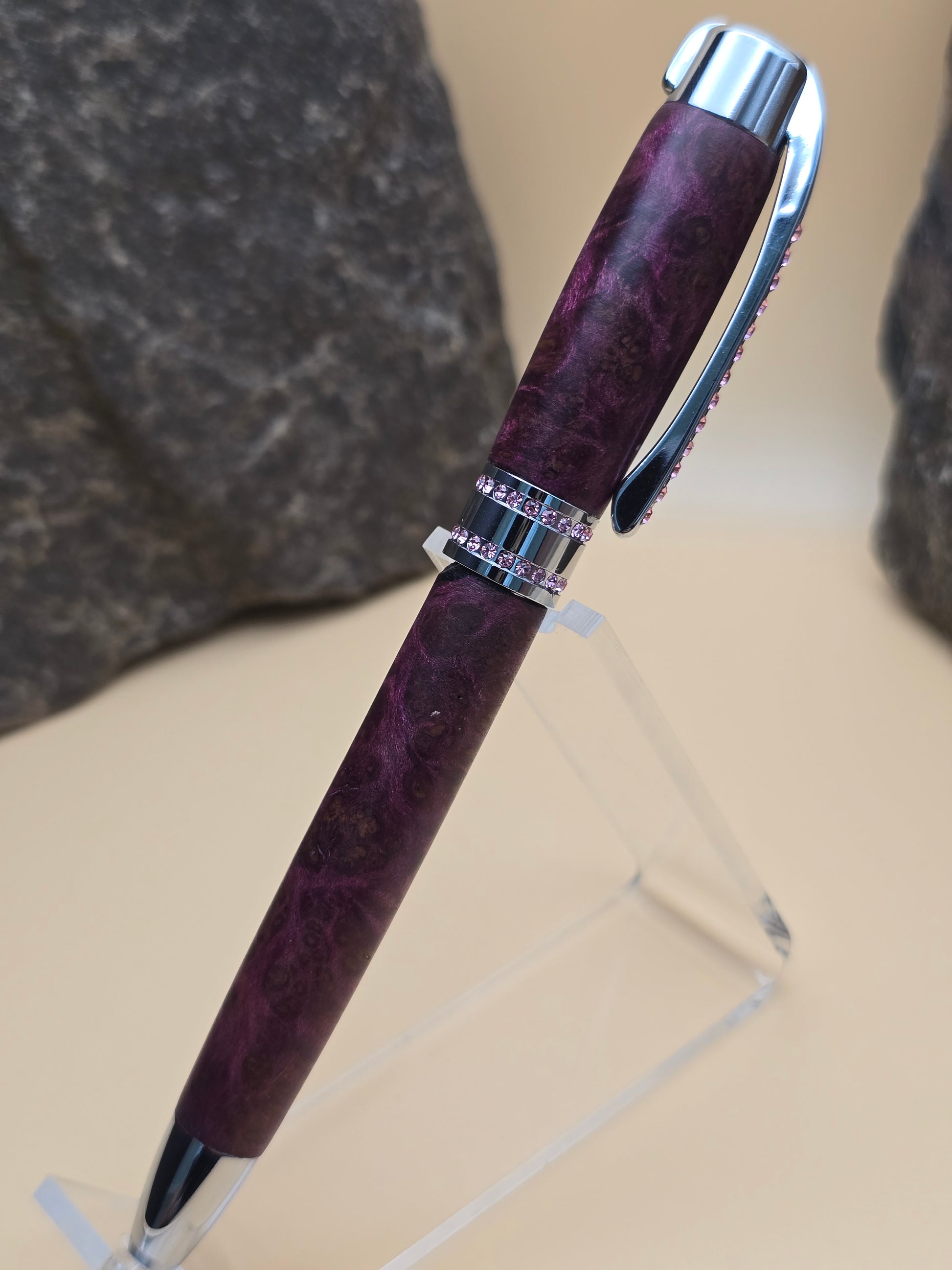 Made with purple dyed box elder burl, this ballpoint pen is adorned with pink Swarovski Crystals embedded in the clip as well as the center band.