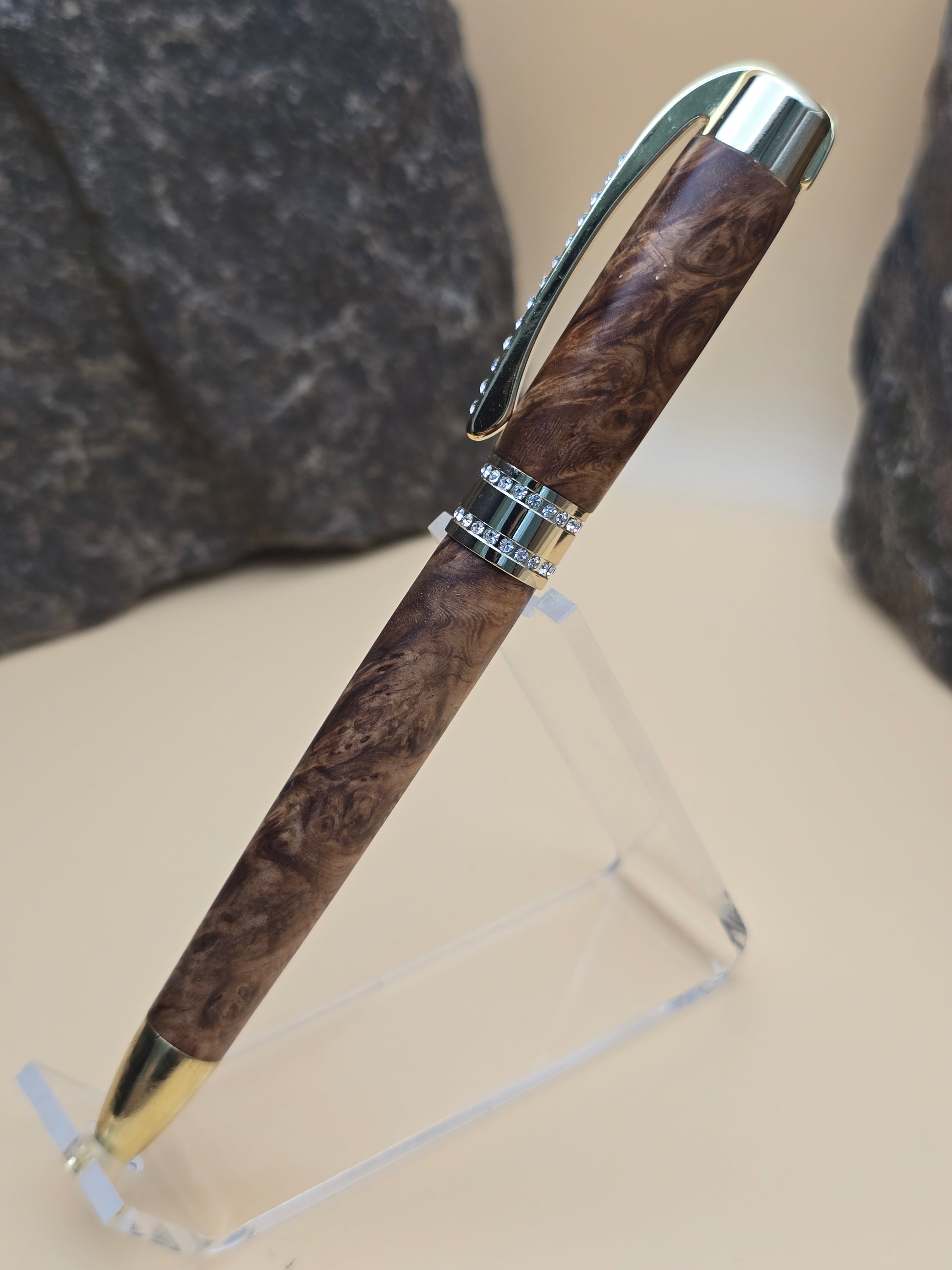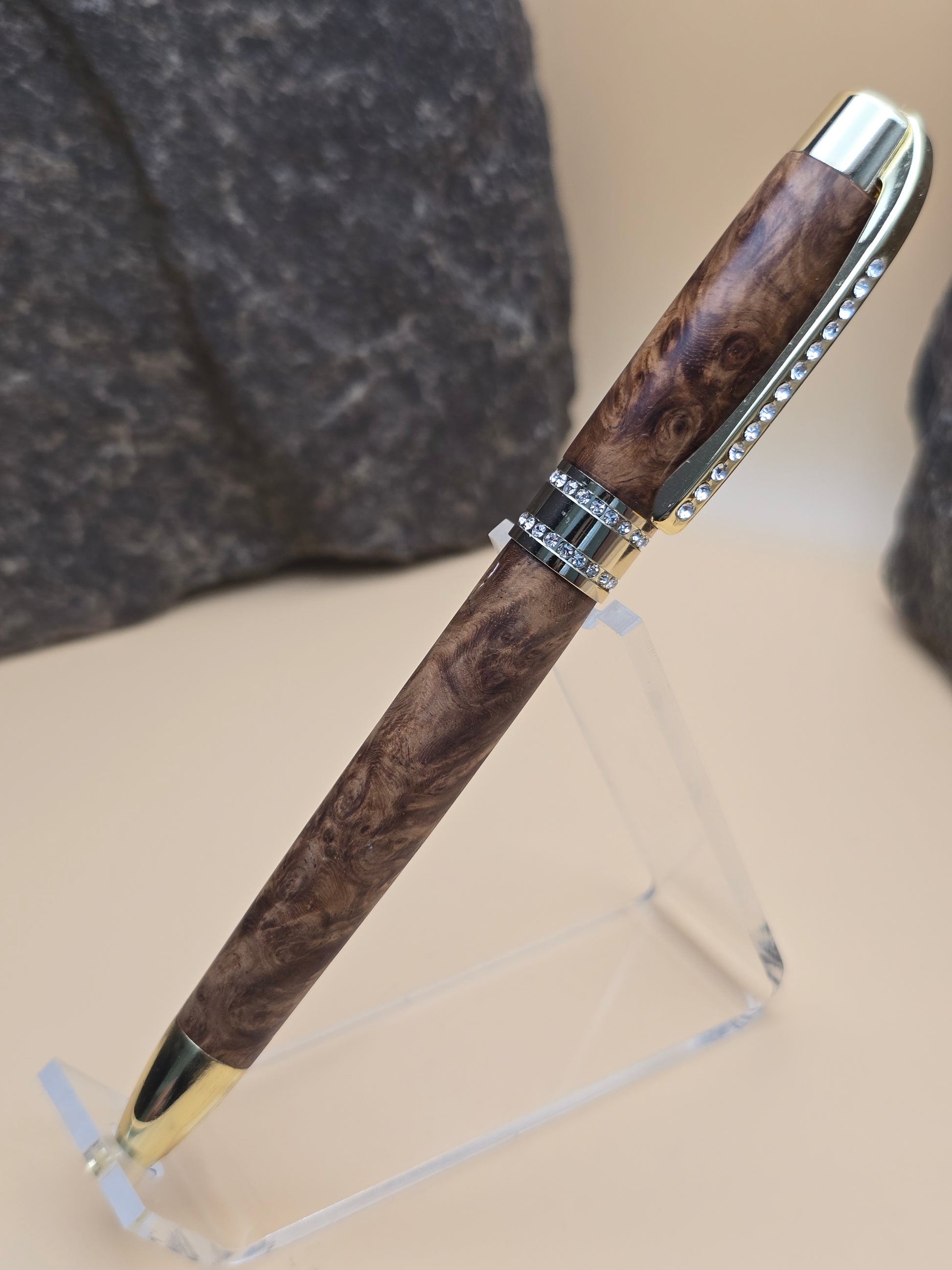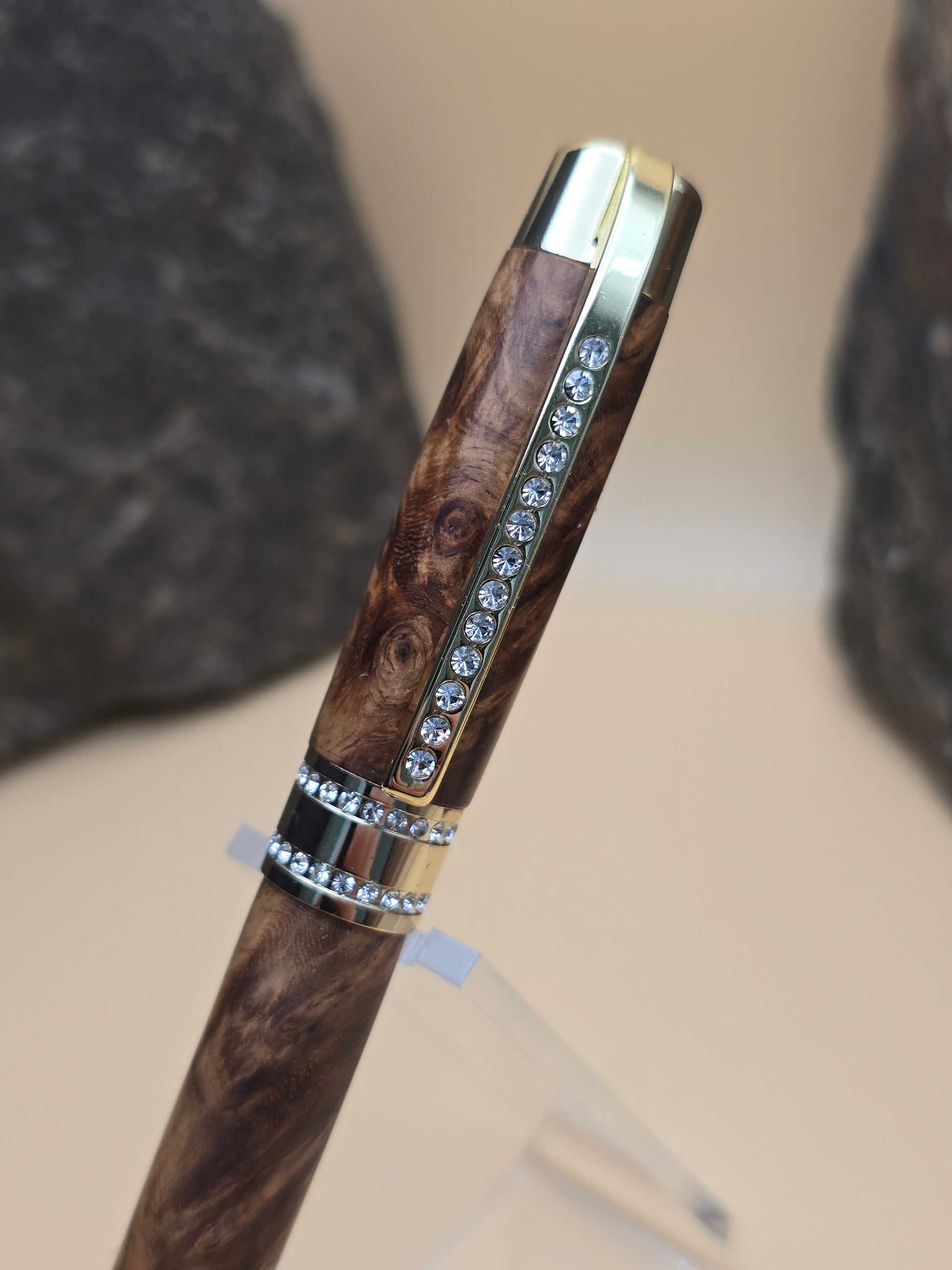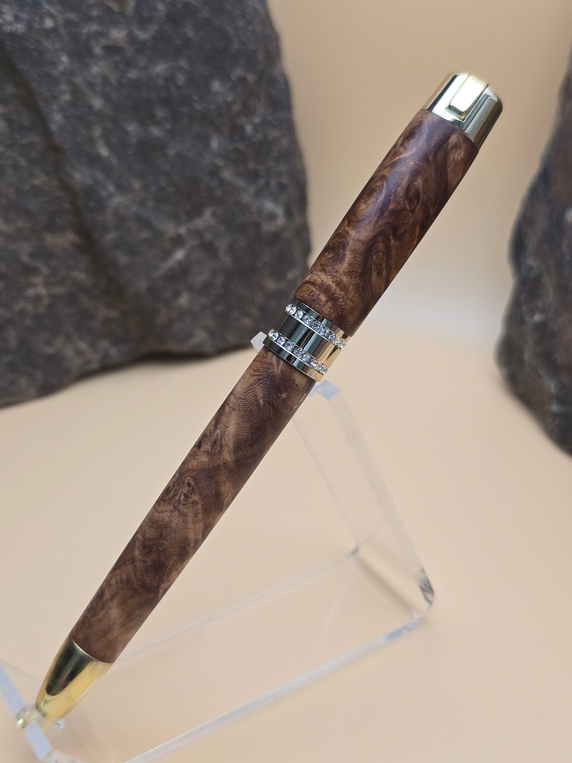 Made with Rare amboyna burl, this Ballpoint Pen features chrome finish, with Swarovski Crystals embedded in the clip and center band.