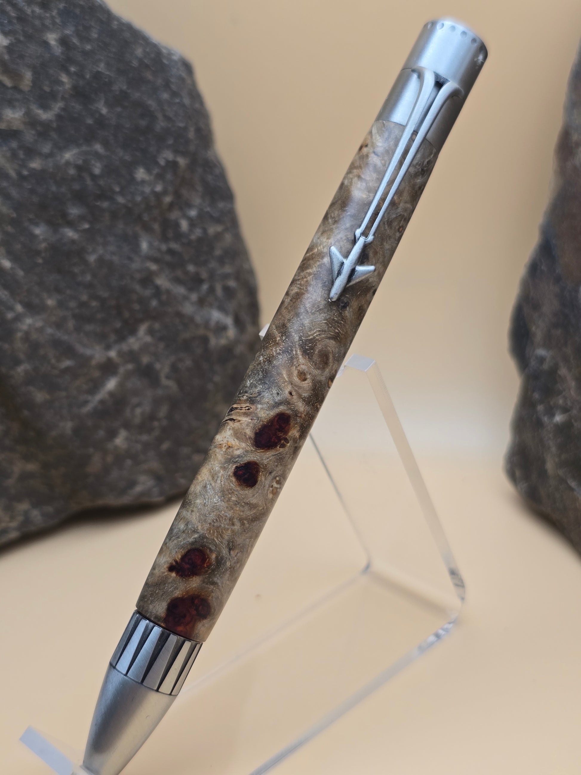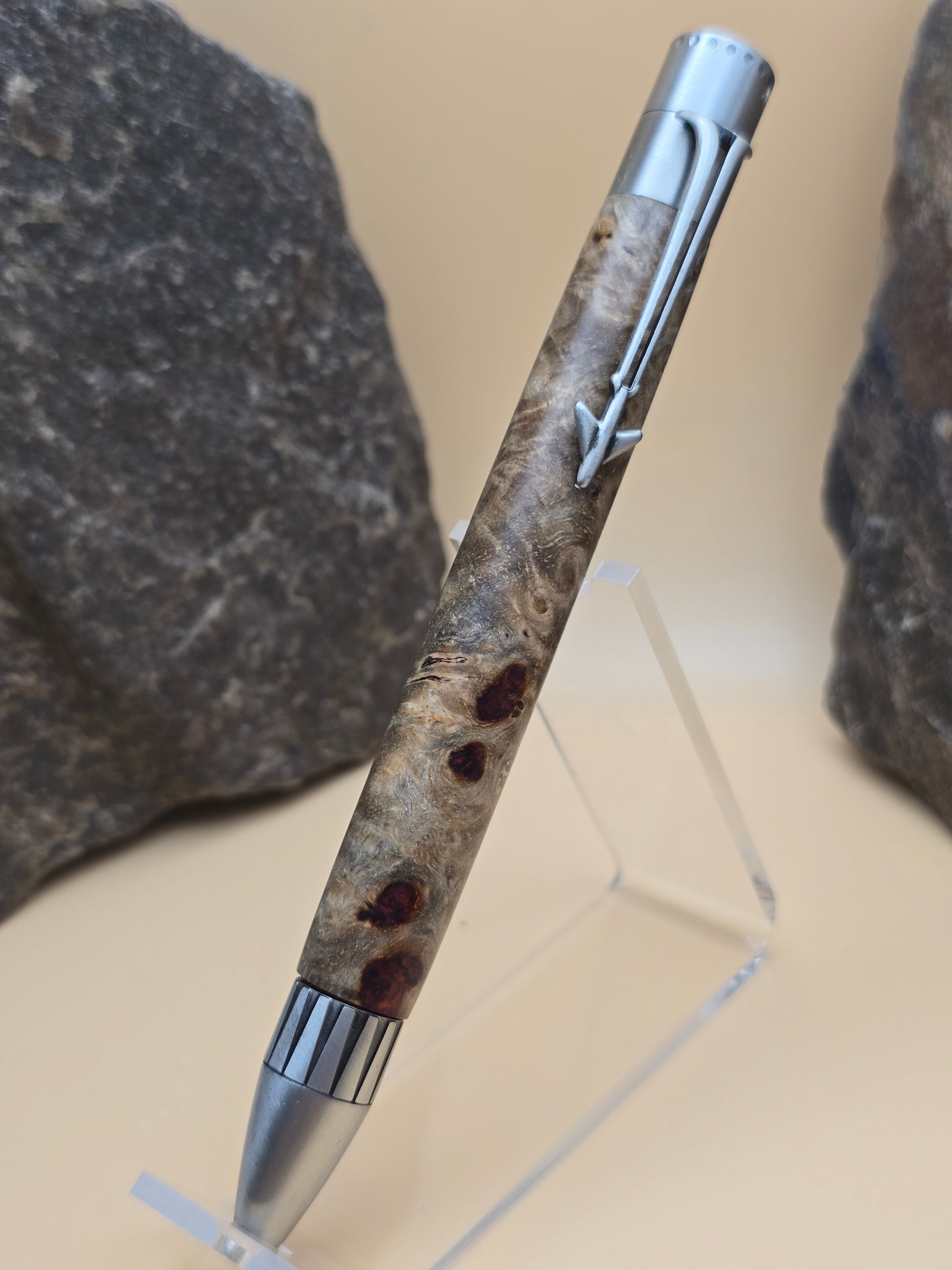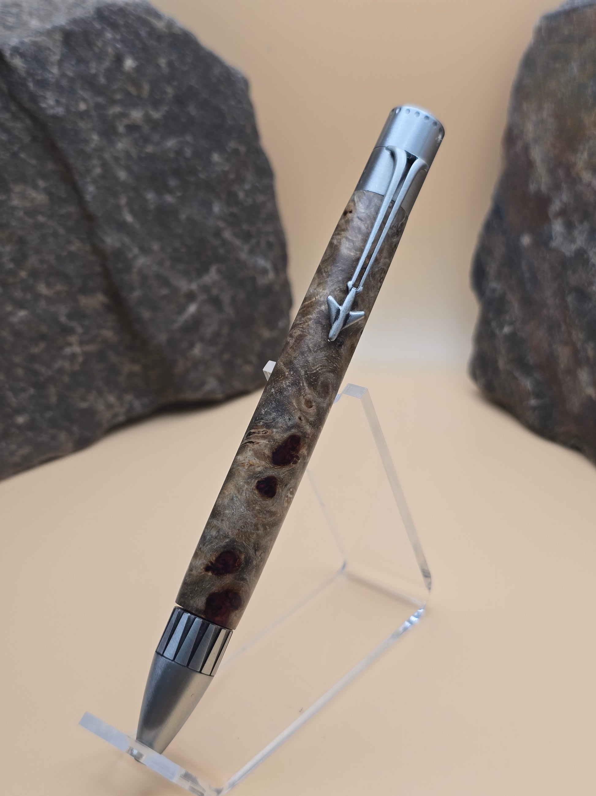 This ballpoint pen features rare Amboyna Burl, paired with an airline theme pen. A commercial airliner on the clip, and a turbine on the crown complete the decor.