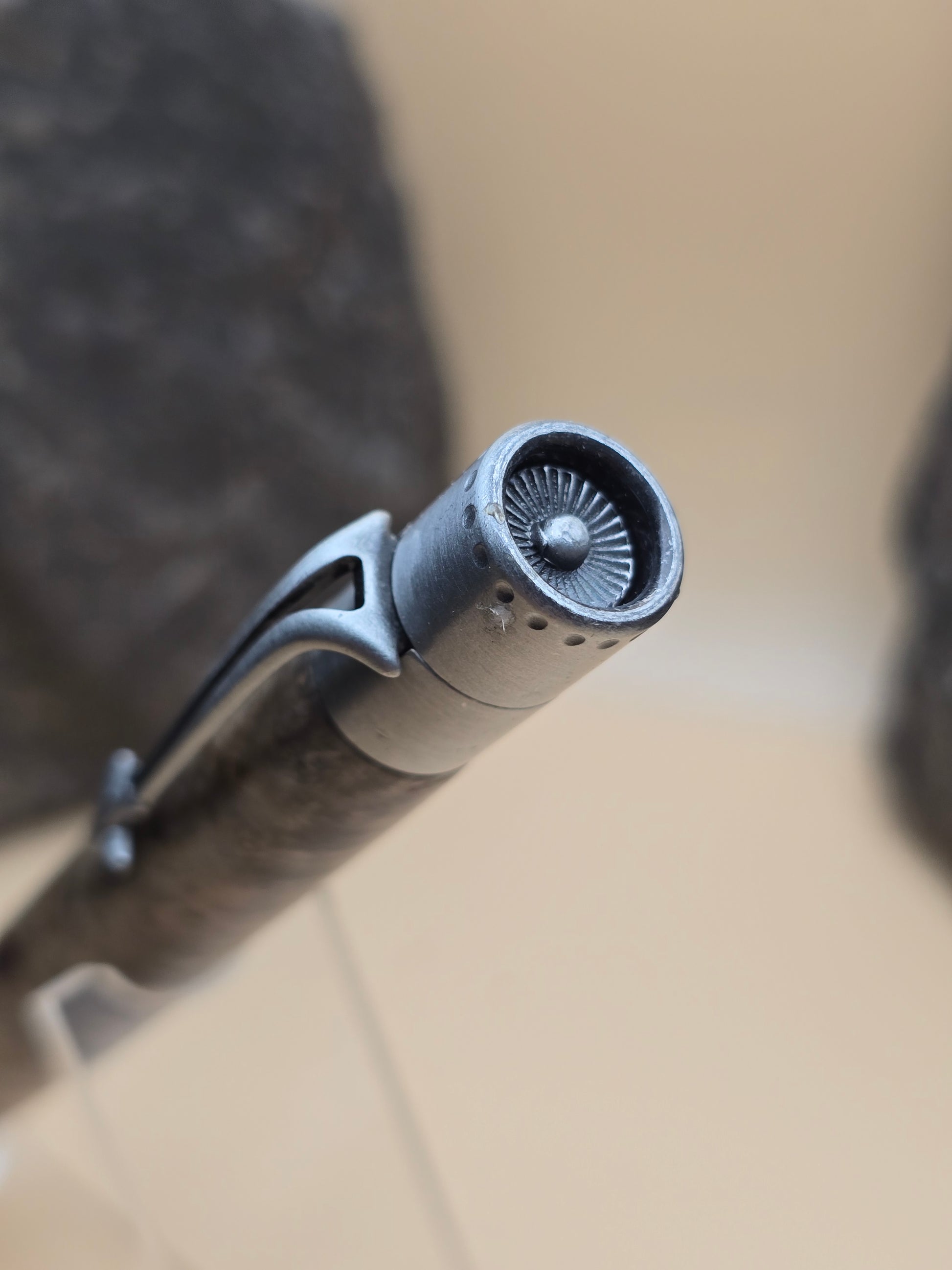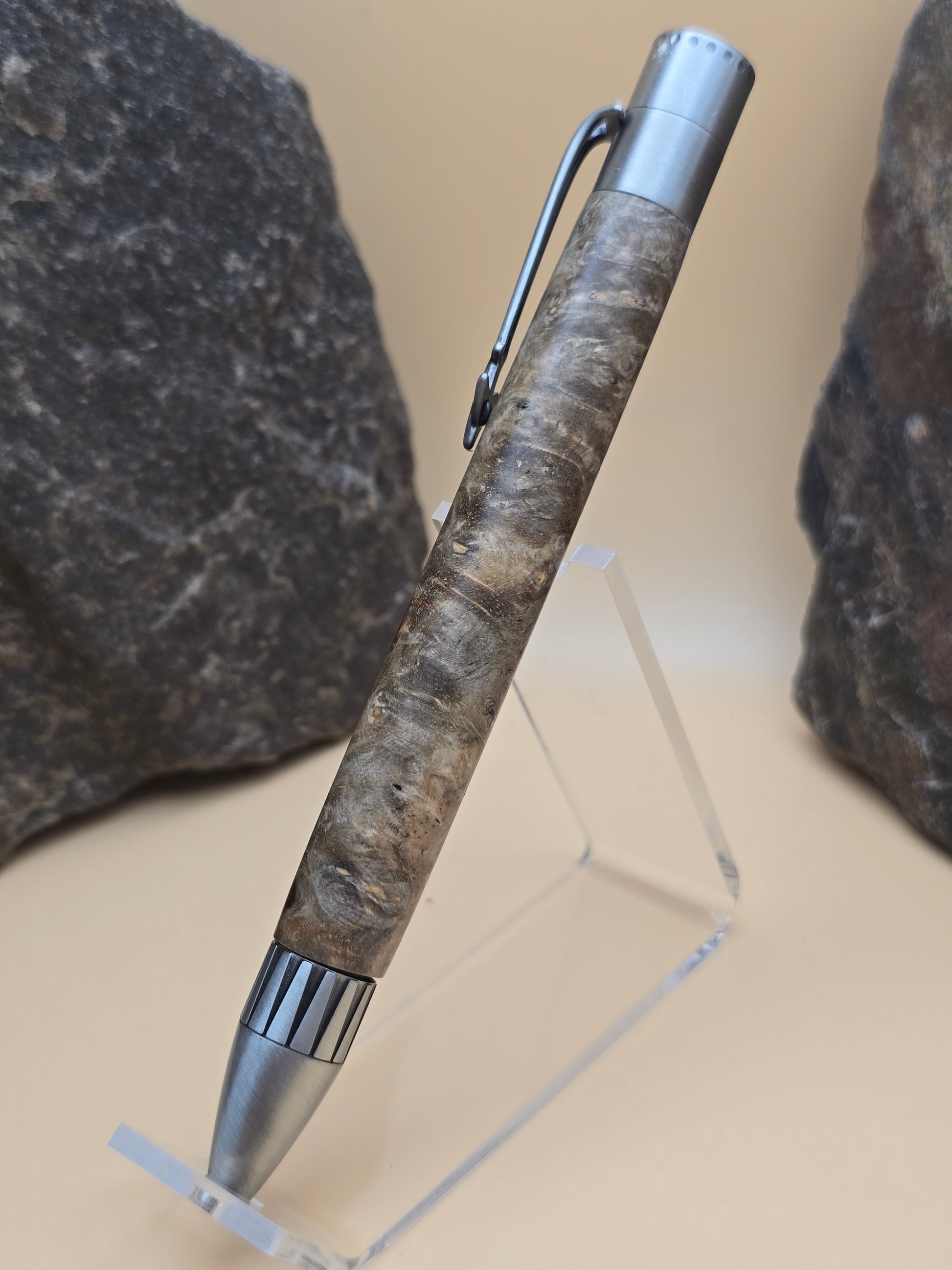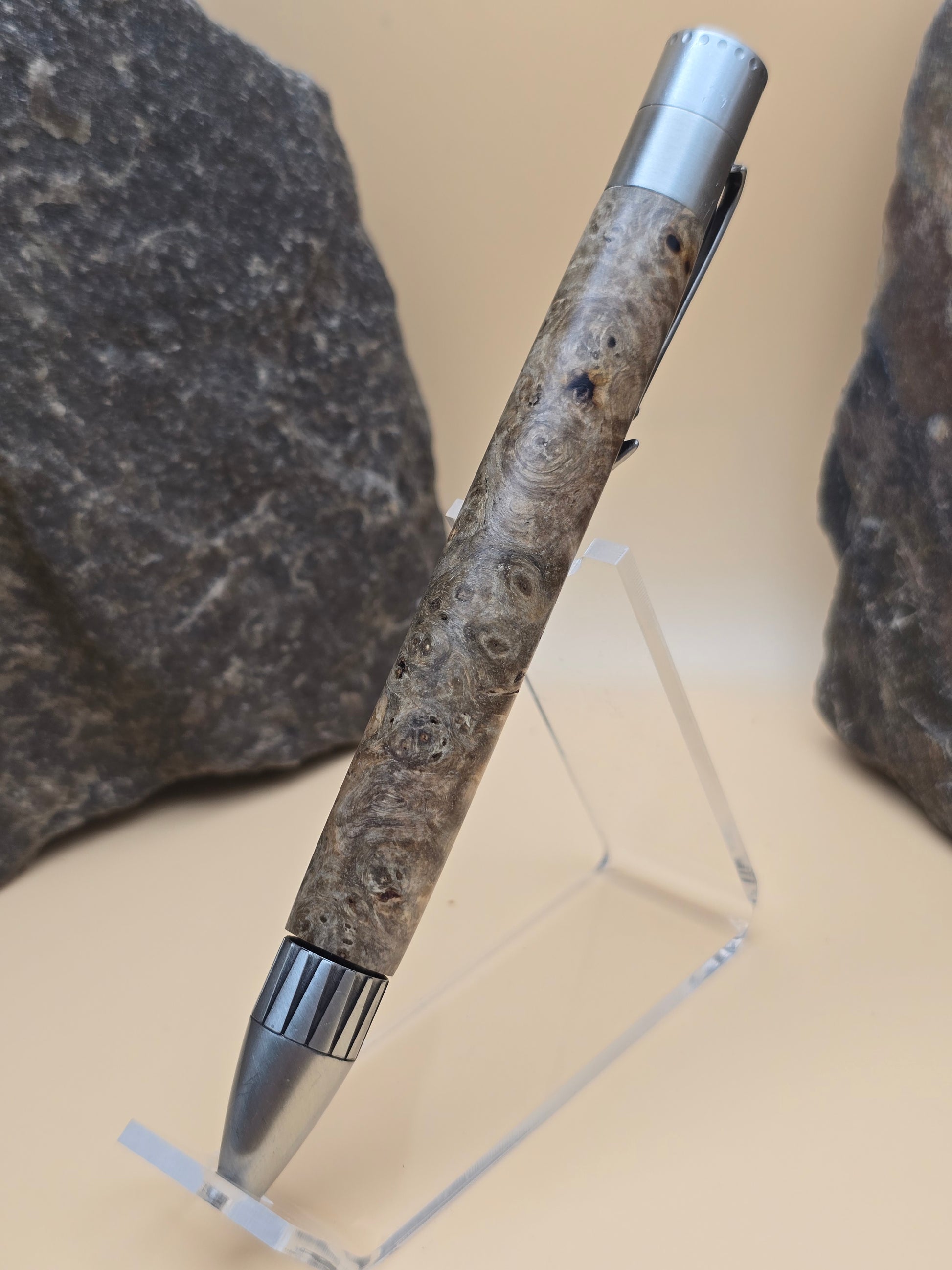 This ballpoint pen features rare Amboyna Burl, paired with an airline theme pen. A commercial airliner on the clip, and a turbine on the crown complete the decor.