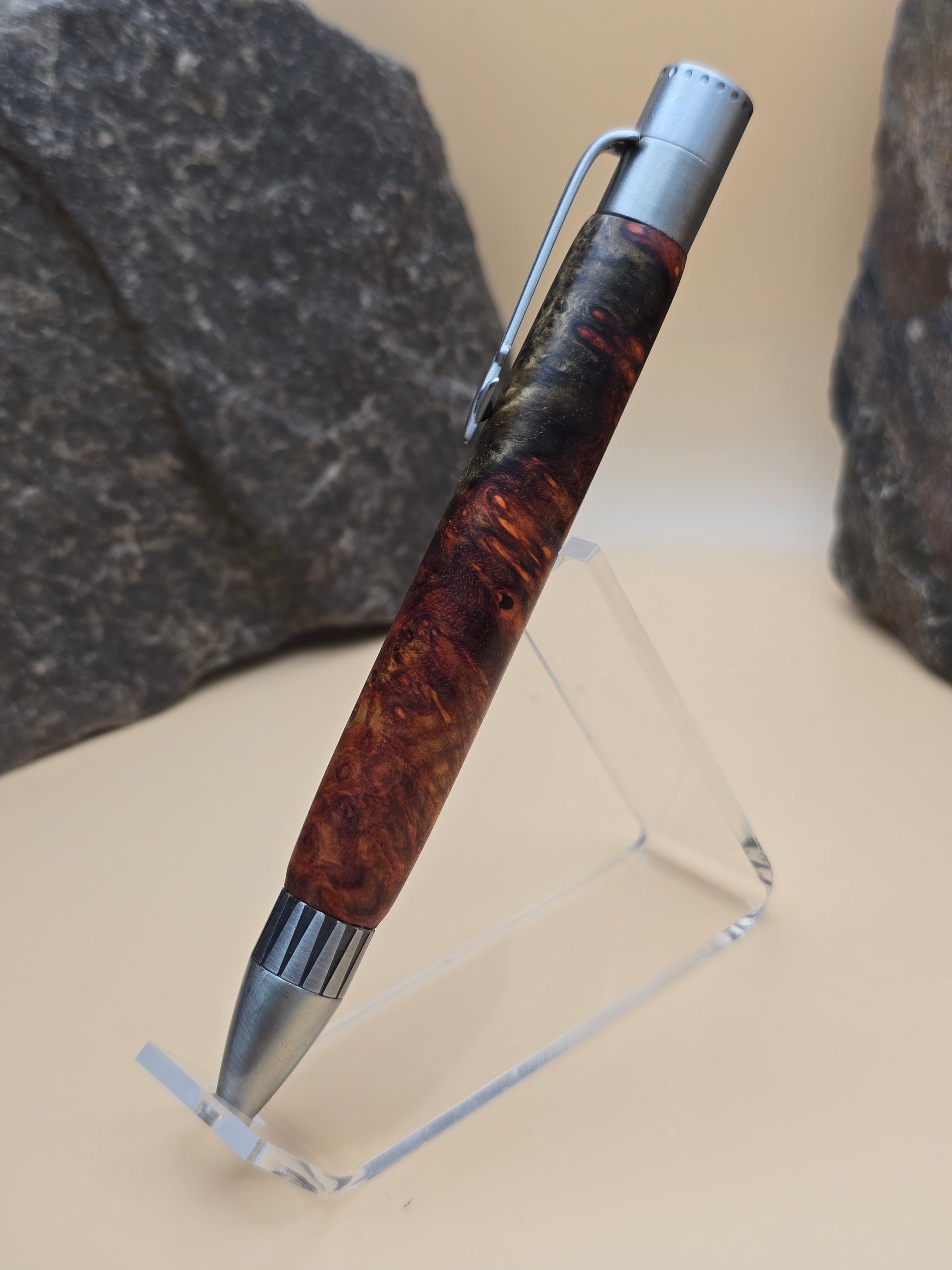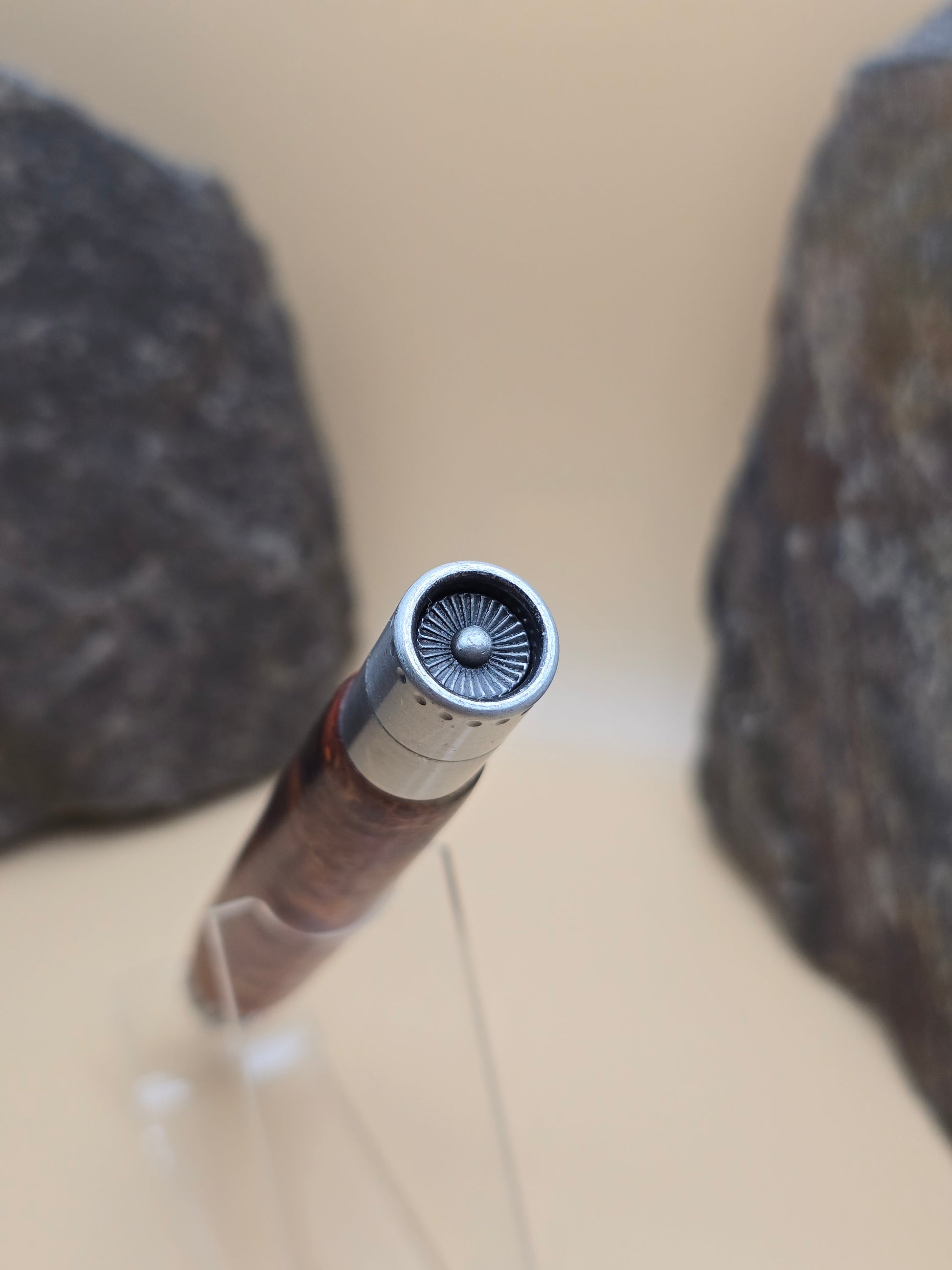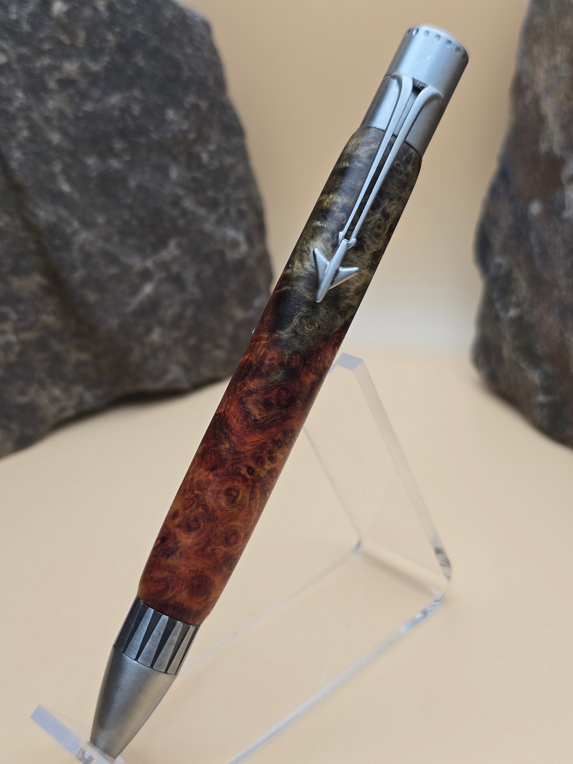 This ballpoint pen features rare Amboyna Burl, paired with an airline theme pen. A commercial airliner on the clip, and a turbine on the crown complete the decor.