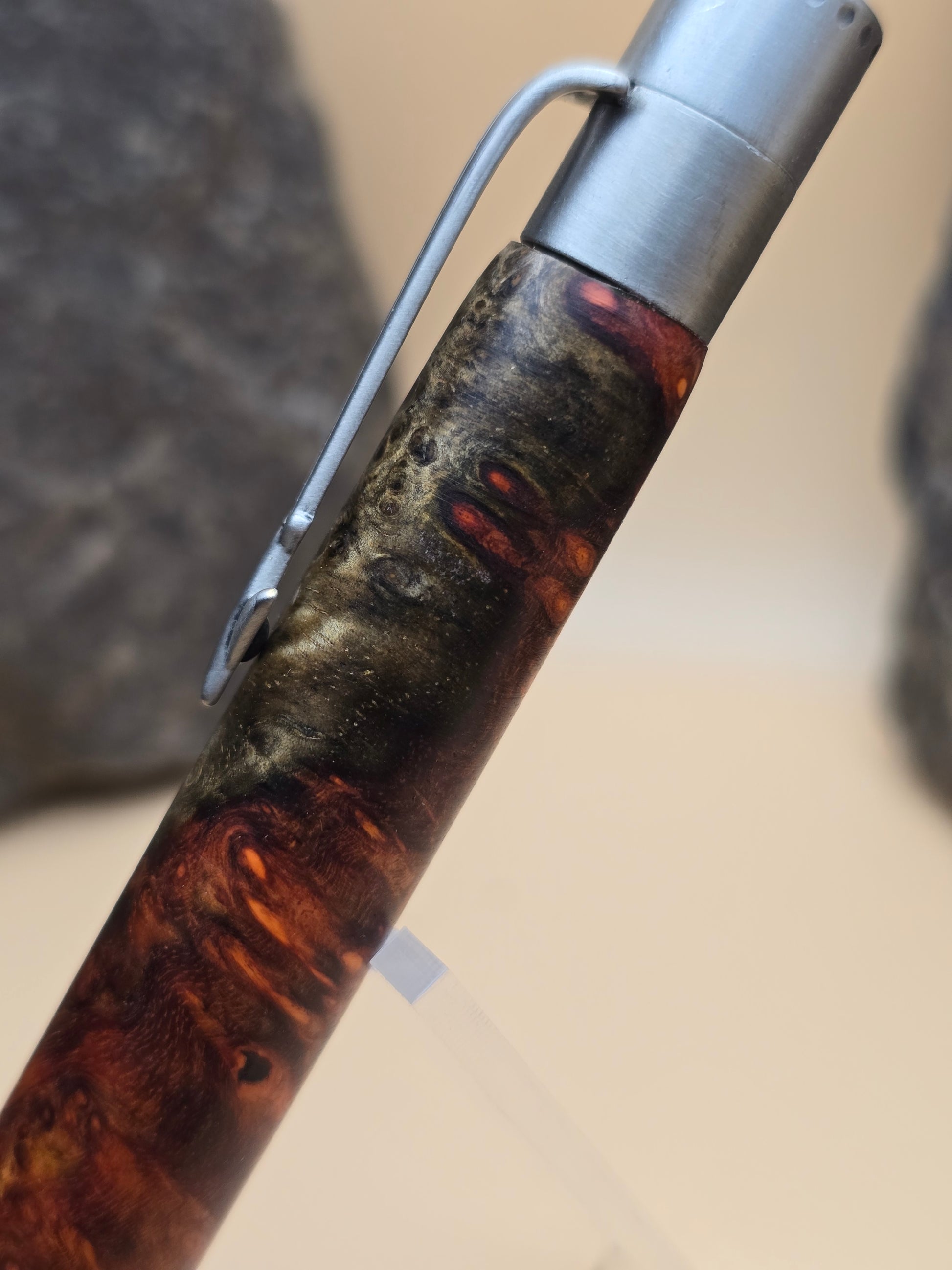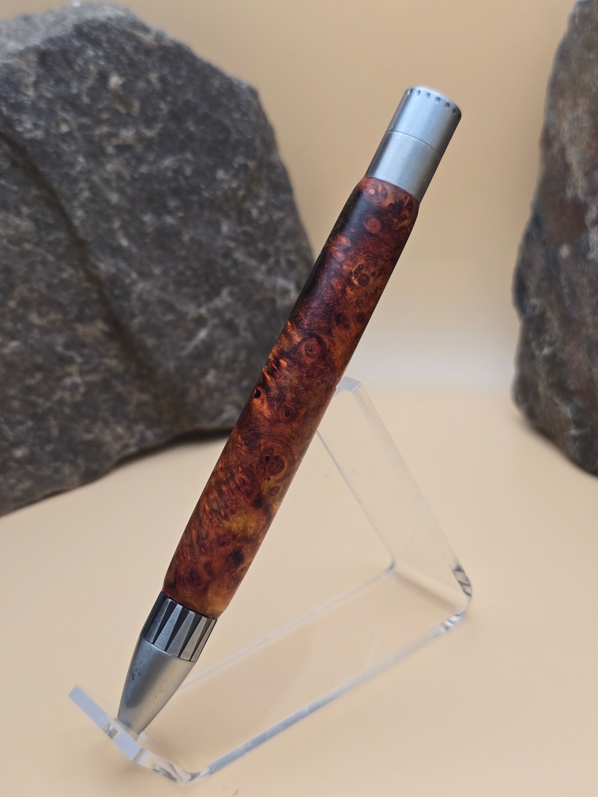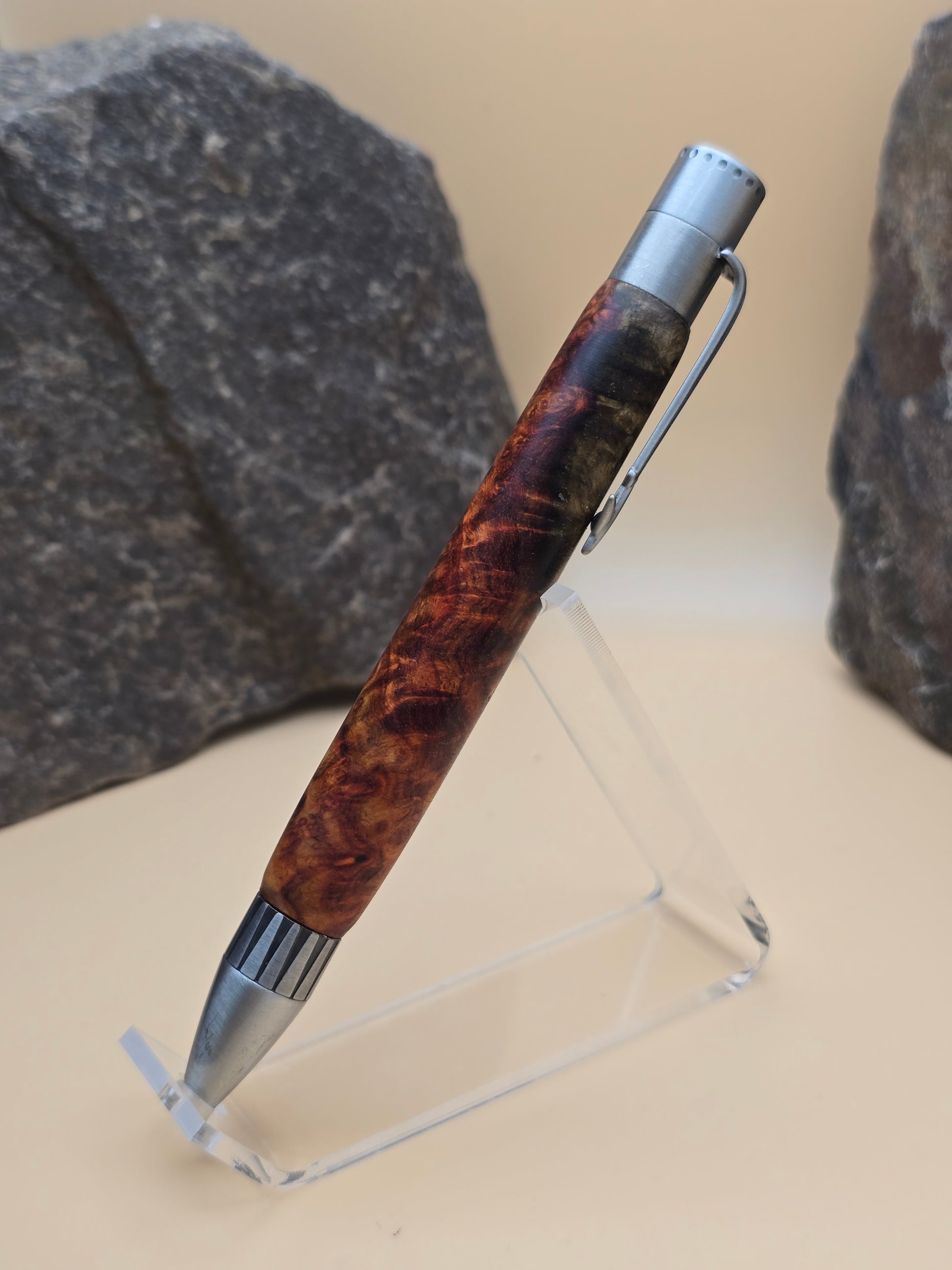 This ballpoint pen features rare Amboyna Burl, paired with an airline theme pen. A commercial airliner on the clip, and a turbine on the crown complete the decor.